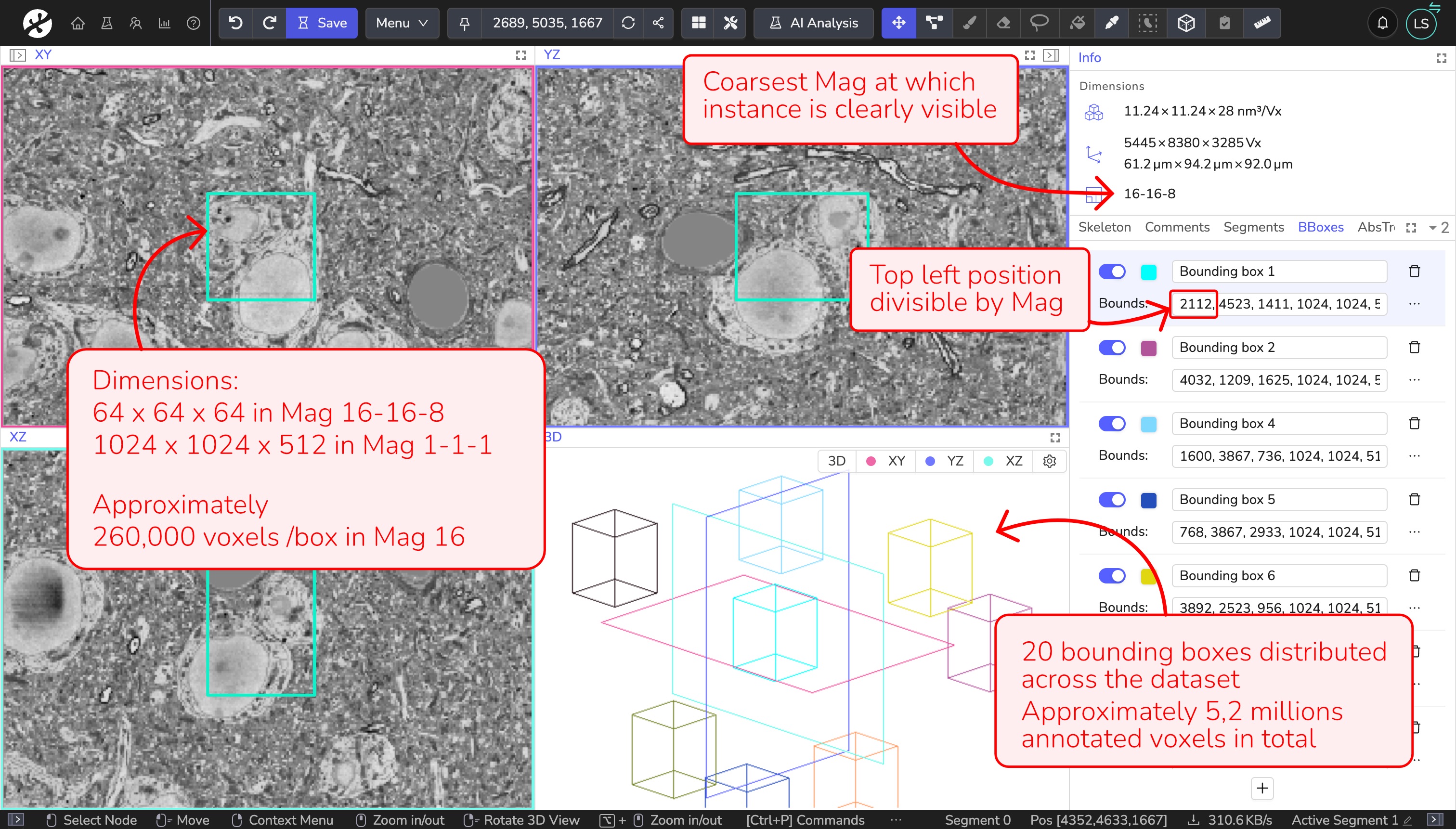 We recommend that each bounding box contains at least 230,000 voxels at the chosen magnification. There are hard minimum dimensions for bounding boxes. To use the annotated data efficiently, bounding box dimensions should ideally be integer multiples of these minimum values. This means that:
