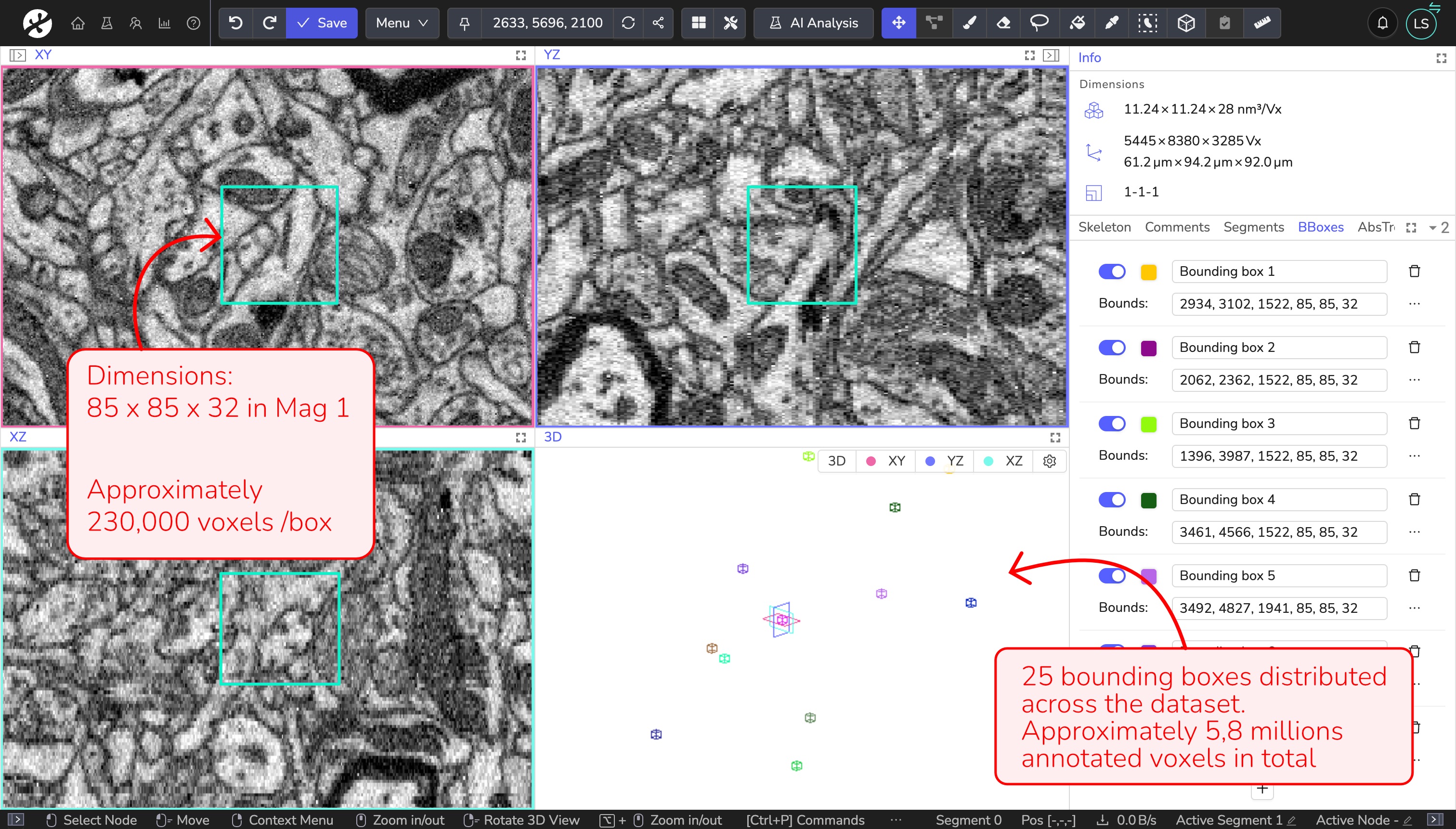 In this example, we create ground truth data to train an EM neuron segmentation model. For this dataset, we work at magnification 1 to resolve neuronal structures clearly. We use bounding boxes of size 85 × 85 × 32 voxels, which corresponds to approximately 230,000 voxels per box. Annotating 25 boxes results in a total annotated volume of approximately 5.8 million voxels.